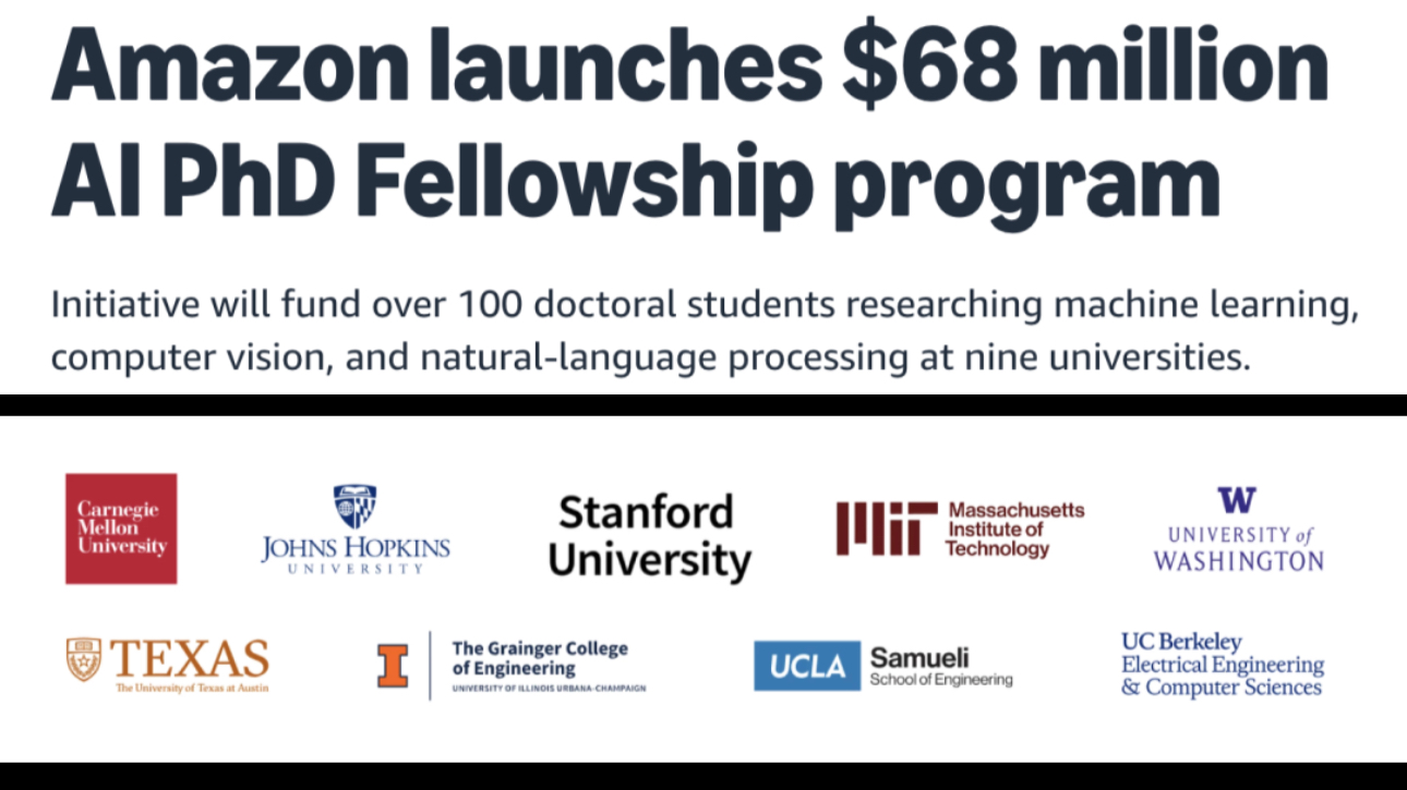 多知10月24日消息,近日,亞馬遜公布了一項(xiàng)總金額6800萬(wàn)美金的AI博士獎(jiǎng)學(xué)金計(jì)劃,該計(jì)劃將于未來(lái)兩年內(nèi)針對(duì)包括卡內(nèi)基梅隆大學(xué)、約翰霍普金斯大學(xué)、斯坦福大學(xué)、麻省理工學(xué)院、加州大學(xué)伯克利分校、加州大學(xué)洛杉磯分校、伊利諾伊大學(xué)厄巴納-香檳分校、德克薩斯大學(xué)奧斯汀分校、華盛頓大學(xué)在內(nèi)共計(jì)9所大學(xué)的100余名博士生提供研究資金的支持,用于機(jī)器學(xué)習(xí)、計(jì)算機(jī)視覺(jué)和自然語(yǔ)言處理領(lǐng)域的學(xué)習(xí)。