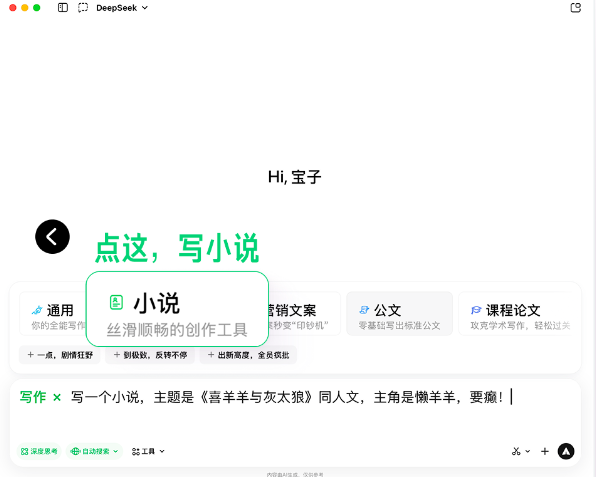 目前,該功能已在元寶手機(jī)端、電腦版和網(wǎng)頁(yè)版同步開(kāi)放。電腦版輸入“@”后選擇“寫(xiě)作”,手機(jī)端點(diǎn)擊輸入框旁的“+”號(hào)進(jìn)入“寫(xiě)作模式”,選擇“寫(xiě)小說(shuō)”, 只需像聊天一樣把想法告訴元寶,就能完成長(zhǎng)篇?jiǎng)?chuàng)作。