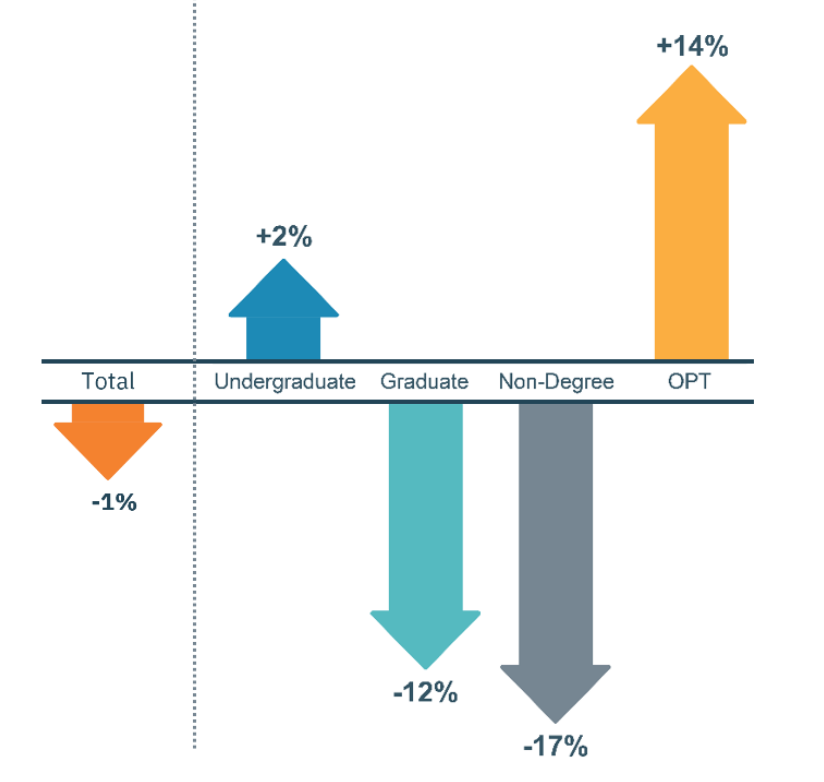 2025年秋季的快照數(shù)據(jù)顯示,這種模式仍在繼續(xù)。各高校報告稱,本科生人數(shù)增加了 2%,實習(xí)生人數(shù)增加了 14%,研究生人數(shù)減少了 12%。而因研究生層次多年強勁增長,OPT人數(shù)持續(xù)上升14%。
